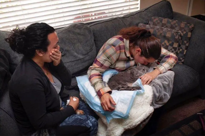 "เธอเป็นเหมือนเพื่อนคู่ใจของฉัน โคโค่อยู่เคียงข้างฉันเสมอ" รีเบกก้า แคสซิตีกลาวขณะพยายามกลั้นน้ำตาเอาไว้ ด้านขวาคือสามีของเธอ ดรูว์ ผู้เคยอยู่ในกองทัพมาก่อน แม้จะเข้มแข็งแค่ไหน แต่การต้องมาดูเจ้าโคโค่หมดลมหายใจลงต่อหน้า ภรรยาที่เศร้าอย่างถึงที่สุด ต่อให้ทหารอกสามศอกก็ต้องมีน้ำตาตกบ้าง...