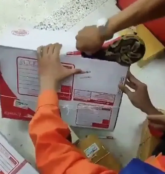 และต้องตกใจสุดขีด เมื่อพบสิ่งที่อยู่ภายในกล่องพัสดุ เป็นงูหลามขนาดใหญ่ ที่พยายามจะดันตัวมันออกมาจากการถูกบรรจุที่แสนอึดอัด ในขณะที่บรุษไปรษณีย์ก็ต้องทำใจดีสู้กับพี่หลาม พยายามจับยัดคืนกลับลงกล่อง ท่ามกลางความใจหายใจคว่ำของผู้คนรอบข้าง ที่ได้แต่ยืนส่งเสียงลุ้นกันสุดฤทธิ์