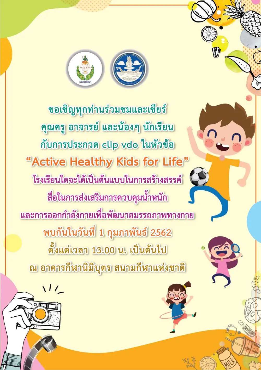 ขอเชิญทุกท่านร่วมชมและเชียร์ คุณครู อาจารย์ และน้องๆ นักเรียน กับการประกวด clip vdo ในหัวข้อ “Active Healthy Kids for Life” โรงเรียนใดจะได้เป็นต้นแบบในการสร้างสรรค์สื่อในการส่งเสริมการควบคุมน้ำหนักและการออกกำลังกายเพื่อพัฒนาสมรรถภาพทางกาย พบกันในวันที่ 1 กุมภาพันธ์ 2562 ตั้งแต่เวลา 13.00 น. เป็นต้นไป ณ อาคารกีฬานิมิบุตร สนามกีฬาแห่งชาติ