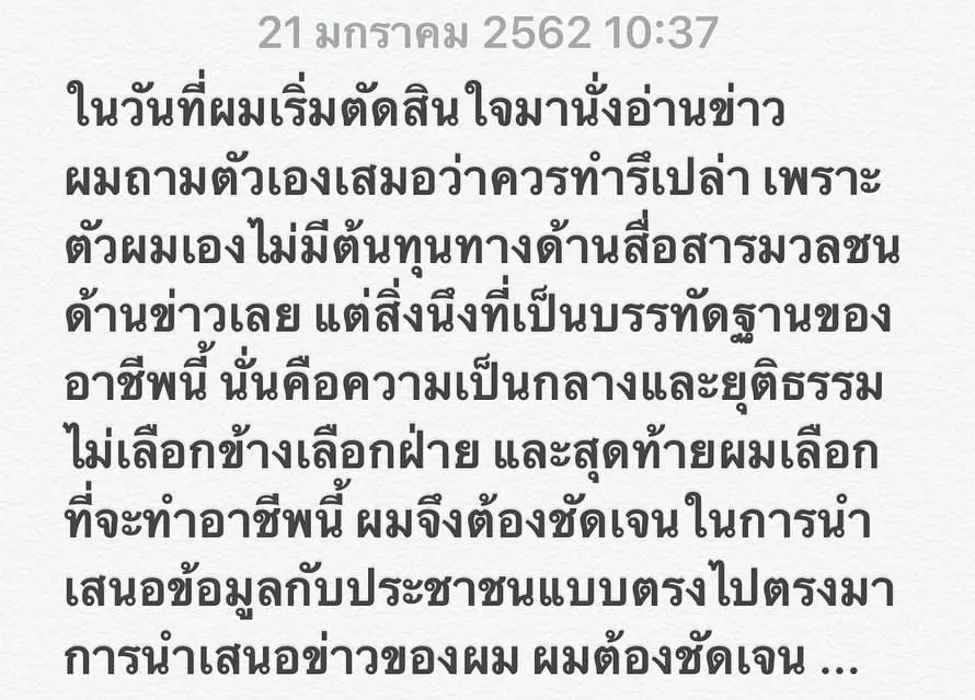 "ในวันที่ผมเริ่มตัดสินใจมานั่งอ่านข่าว ผมถามตัวเองเสมอว่าควรทำรึเปล่า เพราะตัวผมเองไม่มีต้นทุนทางด้านสื่อสารมวลชนด้านข่าวเลย แต่สิ่งนึงที่เป็นบรรทัดฐานของอาชีพนี้ นั่นคือความเป็นกลางและยุติธรรม ไม่เลือกข้างเลือกฝ่าย และสุดท้ายผมเลือกที่จะทำอาชีพนี้ ผมจึงต้องชัดเจนในการนำเสนอข้อมูลกับประชาชนแบบตรงไปตรงมา การนำเสนอข่าวของผม ผมต้องชัดเจน ... มันน่าขำตรงที่ คุณจะให้ผมมัดมือ มัดเท้าคนอื่น แล้วให้คุณชกเค้าฝ่ายเดียว พอผมไม่ยอมทำตาม โดยให้คู่กรณีคุณชี้แจงบ้างเพื่อความเป็นธรรม คุณดันมาโกรธผมซะงั้น บอกเป็นพี่น้องกันเค้าไม่ทำแบบนี้ (เลยฟ้องผมแม่งซะเลย555) ขำอ่ะ..."