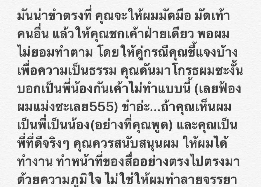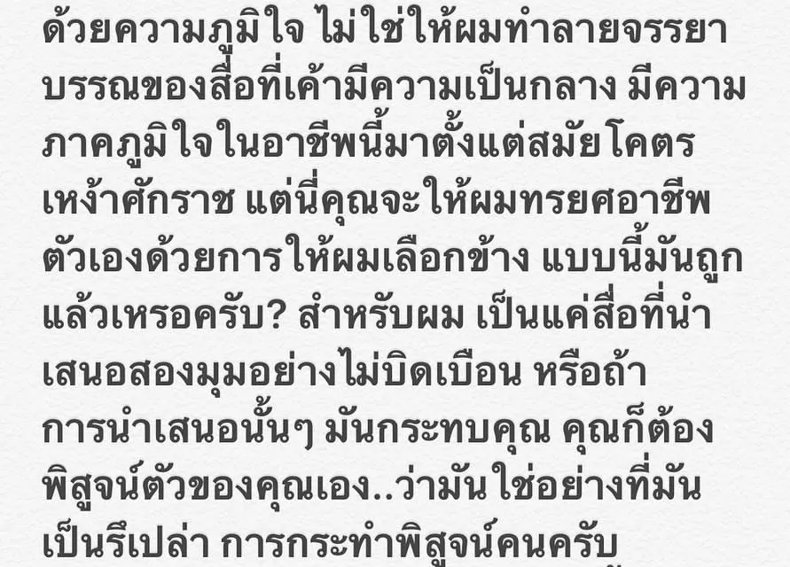 "ถ้าคุณเห็นผมเป็นพี่เป็นน้อง(อย่างที่คุณพูด) และคุณเป็นพี่ที่ดีจริงๆ คุณควรสนับสนุนผม ให้ผมได้ทำงาน ทำหน้าที่ของสื่ออย่างตรงไปตรงมาด้วยความภูมิใจ ไม่ใช่ให้ผมทำลายจรรยาบรรณของสื่อที่เค้ามีความเป็นกลาง มีความภาคภูมิใจในอาชีพนี้มาตั้งแต่สมัยโคตรเหง้าศักราช แต่นี่คุณจะให้ผมทรยศอาชีพตัวเองด้วยการให้ผมเลือกข้าง แบบนี้มันถูกแล้วเหรอครับ? สำหรับผม เป็นแค่สื่อที่นำเสนอสองมุมอย่างไม่บิดเบือน หรือถ้าการนำเสนอนั้นๆ มันกระทบคุณ คุณก็ต้องพิสูจน์ตัวของคุณเอง..ว่ามันใช่อย่างที่มันเป็นรึเปล่า การกระทำพิสูจน์คนครับ