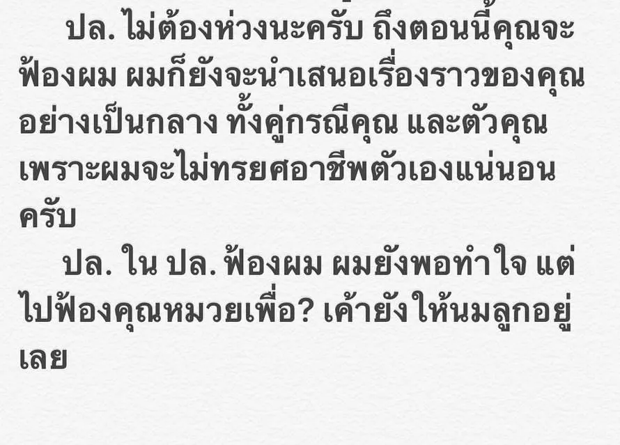 ปล. ไม่ต้องห่วงนะครับ ถึงตอนนี้คุณจะฟ้องผม ผมก็ยังจะนำเสนอเรื่องราวของคุณอย่างเป็นกลาง ทั้งคู่กรณีคุณ และตัวคุณ เพราะผมจะไม่ทรยศอาชีพตัวเองแน่นอนครับ ปล. ใน ปล. ฟ้องผม ผมยังพอทำใจ แต่ไปฟ้องคุณหมวยเพื่อ? เค้ายังให้นมลูกอยู่เลย"