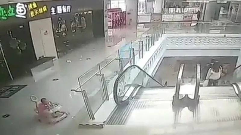 ภาพจากกล้องวงจรปิด เผยให้เห็นว่าบริเวณเคาน์เตอร์หน้าร้านก็ไม่มีคนอีกด้วย เด็กน้อยอยู่บนรถเข็นหัดเดินของเธอ เธอขยับเตาะแตะไปเรื่อย ๆ จนออกมานอกประตูร้าน และมุ่งหน้าไปยังบันไดเลื่อน ซึ่งทันทีที่พ้นขอบบันได้เลื่อนขาขึ้น เด็กหญิงก็ล้มคว่ำหัวทิ่มหัวตำอยู่ตรงนั้น