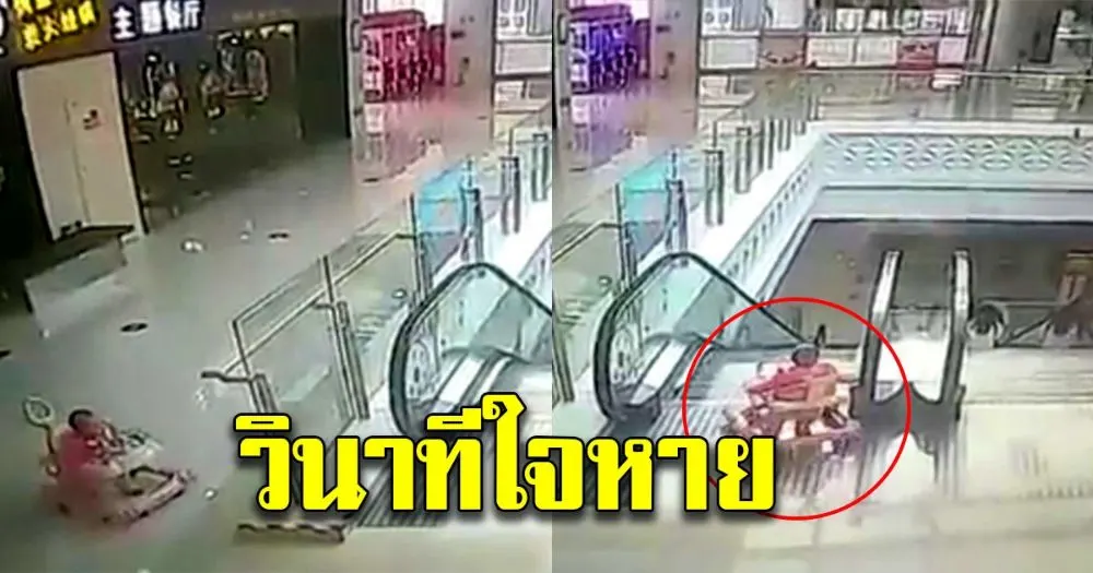 วินาที หนูน้อยเข็นรถเตาะแตะ ร่วงบันไดเลื่อน โชคดีทหารหนุ่มกระโดดช่วย(คลิป)
