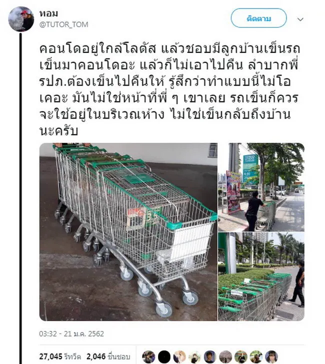 “คอนโดอยู่ใกล้โลตัส แล้วชอบมีลูกบ้านเข็นรถเข็นมาคอนโดอะ แล้วก็ไม่เอาไปคืน ลำบากพี่รปภ.ต้องเข็นไปคืนให้ รู้สึกว่าทำแบบนี้ไม่โอเคอะ มันไม่ใช่หน้าที่พี่ ๆ เขาเลย รถเข็นก็ควรจะใช้อยู่ในบริเวณห้าง ไม่ใช่เข็นกลับถึงบ้านนะครับ”