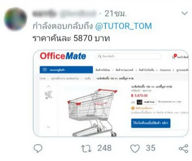 โดยมีผู้ใช้ทวิตเตอร์ @TUTOR_TOM ได้ทวีตข้อความพร้อมภาพว่า