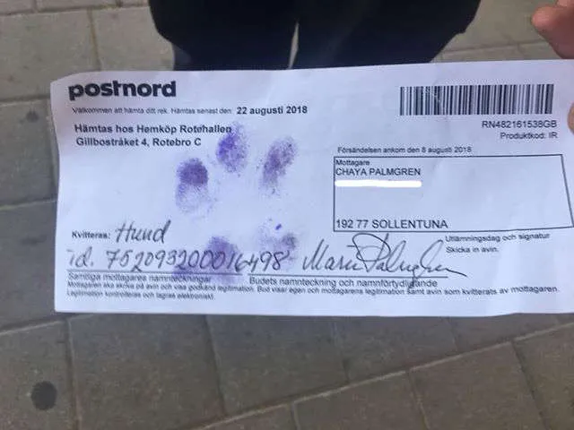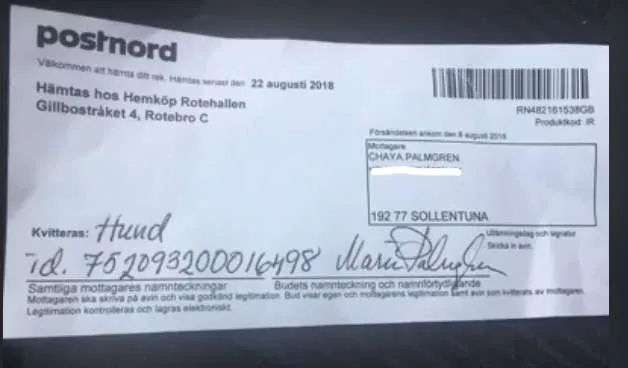 เรื่องนี้เกิดขึ้นในช่วงต้นเดือนที่ผ่านมา เมื่อ "Palmgren" ได้รับโน้ตจากคนส่งจดหมายว่ามีพัสดุขนาดใหญ่ถูกส่งมา และให้มารับที่ที่ทำการไปรษณีย์ แต่พัสดุดังกล่าวถูกส่งมาให้ Chaya ซึ่งเป็นของเล่นสำหรับสุนัข ที่ถูกส่งมาจากครอบครัวของเพื่อนน้องหมาในต่างประเทศ แม้จะยังรู้สึกงงๆ แต่ Palmgren ได้มุ่งหน้าไปยังที่ทำการไปรษณีย์ เพื่อรับพัสดุ เมื่อไปถึง เธอได้ถามได้เจ้าหน้าที่ว่าควรกรอกแบบฟอร์มการรับยังไง เพราะตามระเบียบแล้วจะต้องลงชื่อผู้รับและแสดงบัตรประจำตัวประชาชน