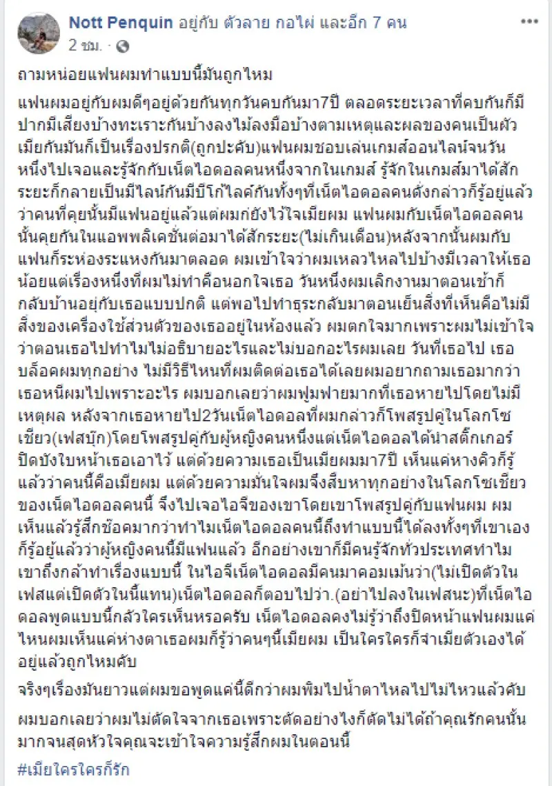 ถามหน่อยแฟนผมทำแบบนี้มันถูกไหม แฟนผมอยู่กับผมดีๆอยู่ด้วยกันทุกวันคบกันมา7ปี ตลอดระยะเวลาที่คบกันก็มีปากมีเสียงบ้างทะเราะกันบ้างลงไม้ลงมือบ้างตามเหตุและผลของคนเป็นผัวเมียกันมันก็เป็นเรื่องปรกติ(ถูกปะคับ)แฟนผมชอบเล่นเกมส์ออนไลน์จนวันหนึ่งไปเจอและรู้จักกับเน็ตไอดอลคนหนึ่งจากในเกมส์ รู้จักในเกมส์มาได้สักระยะก็กลายเป็นมีไลน์กันมีบีโก้ไลค์กันทั้งๆที่เน็ตไอดอลคนดั่งกล่าวก็รู้อยู่แล้วว่าคนที่คุยนั้นมีแฟนอยู่แล้วแต่ผมก่ยังไว้ใจเมียผม แฟนผมกับเน็ตไอดอลคนนั้นคุยกันในแอพพลิเคชั่นต่อมาได้สักระยะ(ไม่เกินเดือน)หลังจากนั้นผมกับแฟนก็ระห่องระแหงกันมาตลอด ผมเข้าใจว่าผมเหลวไหลไปบ้างมีเวลาให้เธอน้อยแต่เรื่องหนึ่งที่ผมไม่ทำคือนอกใจเธอ วันหนึ่งผมเลิกงานมาตอนเช้าก็กลับบ้านอยุ่กับเธอแบบปกติ แต่พอไปทำธุระกลับมาตอนเย็นสิ่งที่เห็นคือไม่มีสิ่งของเครื่องใช้ส่วนตัวของเธออยู่ในห้องแล้ว ผมตกใจมากเพราะผมไม่เข้าใจว่าตอนเธอไปทำไมไม่อธิบายอะไรและไม่บอกอะไรผมเลย วันที่เธอไป เธอบล็อคผมทุกอย่าง ไม่มีวิธีไหนที่ผมติดต่อเธอได้เลยผมอยากถามเธอมากว่าเธอหนีผมไปเพราะอะไร ผมบอกเลยว่าผมฟูมฟายมากที่เธอหายไปโดยไม่มีเหตุผล หลังจากเธอหายไป2วันเน็ตไอดอลที่ผมกล่าวก็โพสรูปคู่ในโลกโซเชียว(เฟสบุ๊ก)โดยโพสรูปคู่กับผู้หญิงคนหนึ่งแต่เน็ตไอดอลได้นำสติ๊กเกอร์ปิดบังใบหน้าเธอเอาไว้ แต่ด้วยความเธอเป็นเมียผมมา7ปี เห็นแค่หางคิวก็รู้แล้วว่าคนนี้คือเมียผม แต่ด้วยความมั่นใจผมจึงสืบหาทุกอย่างในโลกโซเชียวของเน็ตไอดอลคนนี้ จึงไปเจอไอจีของเขาโดยเขาโพสรูปคู่กับแฟนผม ผมเห็นแล้วรู้สึกช๊อคมากว่าทำไมเน็ตไอดอลคนนี้ถึงทำแบบนี้ได้ลงทั้งๆที่เขาเองก็รู้อยู้แล้วว่าผู้หญิงคนนี้มีแฟนแล้ว อีกอย่างเขาก็มีคนรู้จักทั่วประเทศทำไมเขาถึงกล้าทำเรื่องแบบนี้ ในไอจีเน็ตไอดอลมีคนมาคอมเม้นว่า(ไม่เปิดตัวในเฟสแต่เปิดตัวในนี้แทน)เน็ตไอดอลก็ตอบไปว่า.(อย่าไปลงในเฟสนะ)ที่เน็ตไอดอลพูดแบบนี้กลัวใครเห็นหรอครับ เน็ตไอดอลคงไม่รู้ว่าถึงปิดหน้าแฟนผมแค่ไหนผมเห็นแค่ห่างตาเธอผมก็รู้ว่าคนๆนี้เมียผม เป็นใครใครก็จำเมียตัวเองได้อยู่แล้วถูกไหมคับ