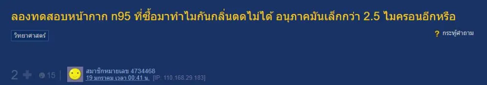 สมาชิกเวบไซต์พันทิปรายหนึ่งโพสท์กระทู้ถาม เกี่ยวกับหน้ากากป้องกันฝุ่นพิษที่กำลังโจมตีเมืองกรุงอยู่ในขณะนี้ คำถามที่ถามคือ ลองทดสอบหน้ากาก n95 ที่ซื้อมาทำไมกันกลิ่นตดไม่ได้ อนุภาคมันเล็กกว่า 2.5 ไมครอนอีกหรือ?