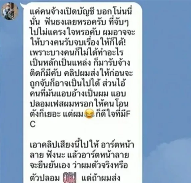 อย่างไรก็ตาม ยังมีการท้าให้นำคลิปเสียง ไปให้อาร์ตหน้าลายฟัง และยืนยันว่า เป็นตัวจริงหรือตัวปลอม เพราะเคยมีการติดต่อกันตลอดเวลา
