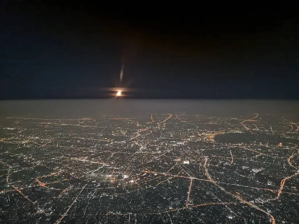 ล่าสุด (24 ม.ค.) ผู้ใช้เฟซบุ๊ค Theeravat Suensilpong เผยภาพจากมุมสูง ถ่ายจากห้องนักบิน เมื่อคืนวันที่ 23 ม.ค. ที่ผ่านมา เผยให้สภาพฝุ่นที่ลอบอยู่บนอากาศอย่างหนาแน่น
