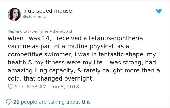 “ตอนฉันอายุ 14 ฉันได้รับวัคซีนป้องกันบาดทะยัก-คอตีบ ซึ่งเป็นส่วนหนึ่งของโปรแกรมตรวจสุขภาพ และเนื่องจากฉันเป็นนักว่ายน้ำ ฉันมีรูปร่างที่ยอดเยี่ยม สุขภาพร่างกายแข็งแรง มีความจุปอดที่น่าทึ่ง และแทบไม่เคยเป็นหวัด แต่การฉีดวัคซีนนั้นได้เปลี่ยนชีวิตฉันเพียงชั่วข้ามคืน”