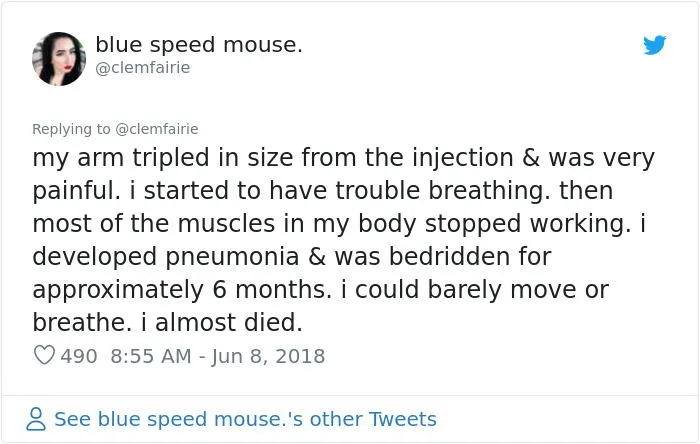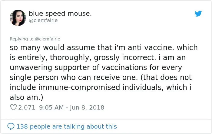 “ตอนนี้ หลายคนอาจคิดว่าฉันเป็นพวกแอนตี้วัคซีน แต่ฉันคือคนที่สนับสนุนการฉีดวัคซีนให้กับทุกๆ คนที่สามารถรับได้อย่างไม่เปลี่ยนแปลง (ซึ่งนั่นไม่รวมคนที่แพ้ภูมิตัวเองเป็นเหมือนฉัน)”