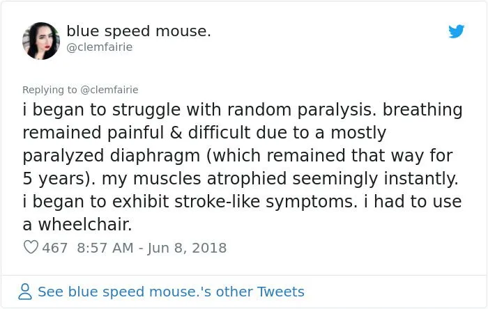 “ฉันเริ่มเป็นอัมพาตบางส่วน ขนาดหายใจยังลำบากและเจ็บมากเนื่องจากกระบังลมเป็นอัมพาตบางส่วน (ที่เป็นแบบนั้นไปอีก 5 ปี) กล้ามเนื้อของฉันลีบลง มีอาการเหมือนเส้นโลหิตไปเลี้ยงสมองอุดตัน จนทำให้ฉันต้องนั่งวีลแชร์”