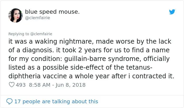 “มันเหมือนตื่นอยู่ในฝันร้าย และเลวร้ายลงเพราะขาดการวินิจฉัยที่ดีพอ มันใช้เวลา 2 ปีสำหรับเราที่จะหาชื่อของโรคฉันว่ามันคือ ‘กลุ่มอาการกิลแลง-บาร์เร’ หรือโรคแพ้ภูมิตัวเอง ซึ่งถูกระบุไว้อย่างเป็นทางการว่า มีความเป็นไปได้ที่เป็นผลข้างเคียงมาจากวัคซีนบาดทะยัก-คอตีบ”