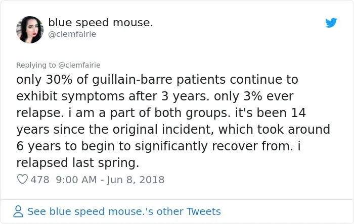 “มีเพียง 30% ของคนเป็นกลุ่มอาการกิลแลง-บาร์เร ที่ยังคงแสดงอาการหลังจาก 3 ปี มีเพียง 3% เท่านั้นที่ทรุดหนัก และฉันอยู่ในทั้ง 2 กลุ่มนี้ มันเป็นเวลา 14 ปีแล้วตั้งแต่เกิดเรื่อง จนใช้เวลา 6 ปีเริ่มต้นฟื้นฟูตัวเอง แต่ฉันก็มาทรุดลงอีกเมื่อฤดูใบไม้ผลิที่ผ่านมา”