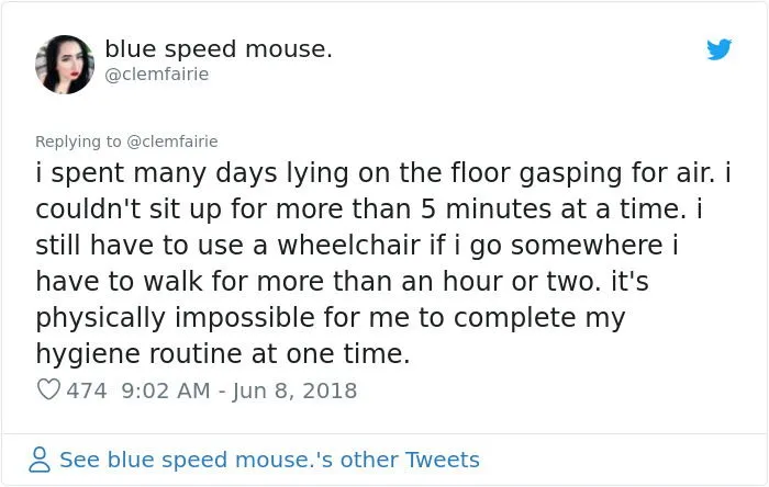 “ฉันใช้เวลาหลายวันนอนหายใจพะงาบๆ อยู่บนพื้น ฉันไม่สามารถนั่งได้เกินกว่า 5 นาทีในแต่ละครั้ง ฉันยังคงใช้วีลแชร์ ถ้าฉันจะไปที่ไหนสักแห่ง ฉันต้องใช้เวลามากกว่า 1-2 ชั่วโมง และมันเป็นไปไม่ได้เลยที่จะดูแลสุขอนามัยของตัวเองแบบรวดเดียวเสร็จ”