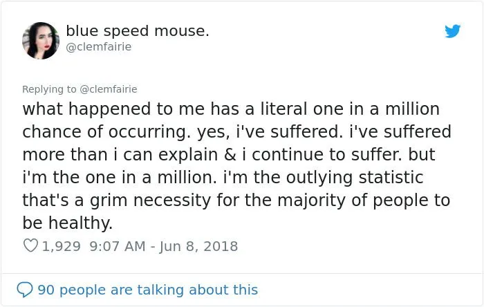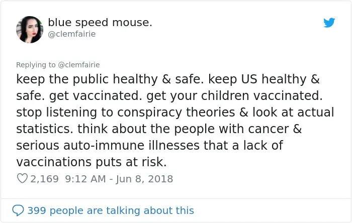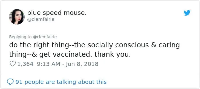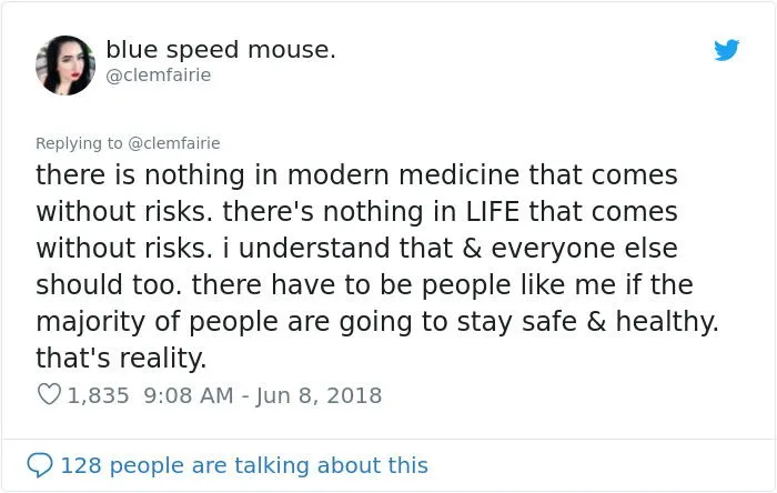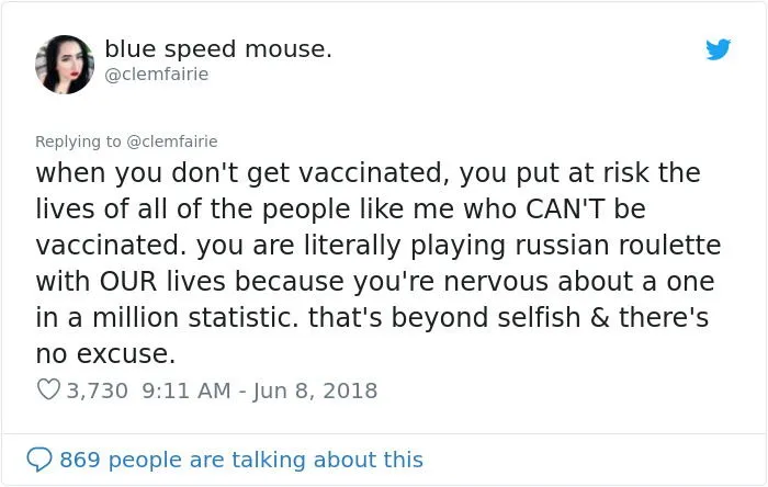 “เมื่อคุณไม่ได้ฉีดวัคซีน คุณก็ทำให้ชีวิตคนอย่างฉันที่ไม่สามารถรับวัคซีนได้ต้องเสี่ยงอันตราย คุณกำลังเล่นรัสเซียนรูเล็ตต์กับชีวิตของพวกเรา เพียงเพราะคุณกังวลกับสถิติ 1 ในล้านงั้นหรือ นั่นมันยิ่งกว่าเห็นแก่ตัว และไม่ควรมีข้อแก้ตัวสำหรับเรื่องนี้”