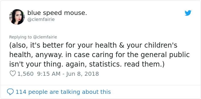 “(เผื่อว่าคุณไม่ได้สนใจคนอื่น มันก็จะดีต่อสุขภาพของตัวคุณและลูกคุณด้วย อีกครั้งนะ สถิติ อ่านมันซะ)”