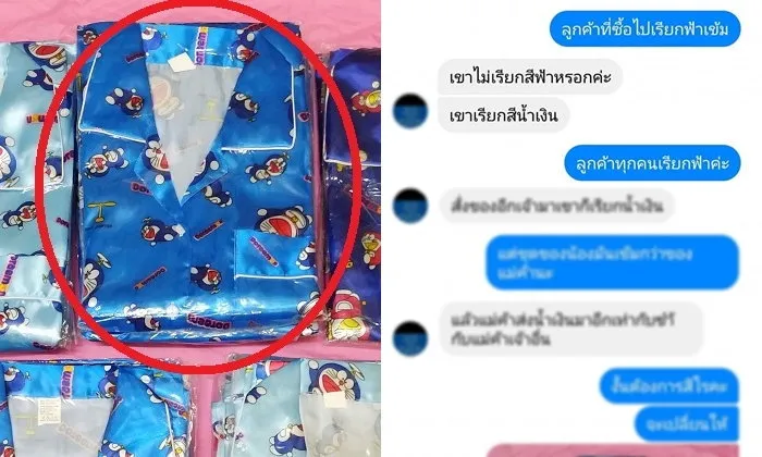 แม่ค้าจึงตัดบทด้วยการให้ลูกค้าส่งคืนมาและจะเปลี่ยนให้ แต่ลูกค้ารายนี้ไม่จบง่ายๆ และหาเหตุผลมาอ้างต่อไปว่าสีฟ้าเข้มของแม่ค้า ใครๆ ก็เรียกสีน้ำเงิน แม่ค้ายังใจเย็นและถามอีกครั้งว่า ลูกค้าต้องการสีอะไรจะเปลี่ยนให้ ซึ่งคราวนี้ลูกค้าบอกว่าต้องการสีฟ้าอ่อน และมีการถ่ายรูปเทียบกันเพื่อไม่ให้ผิดพลาดอีก