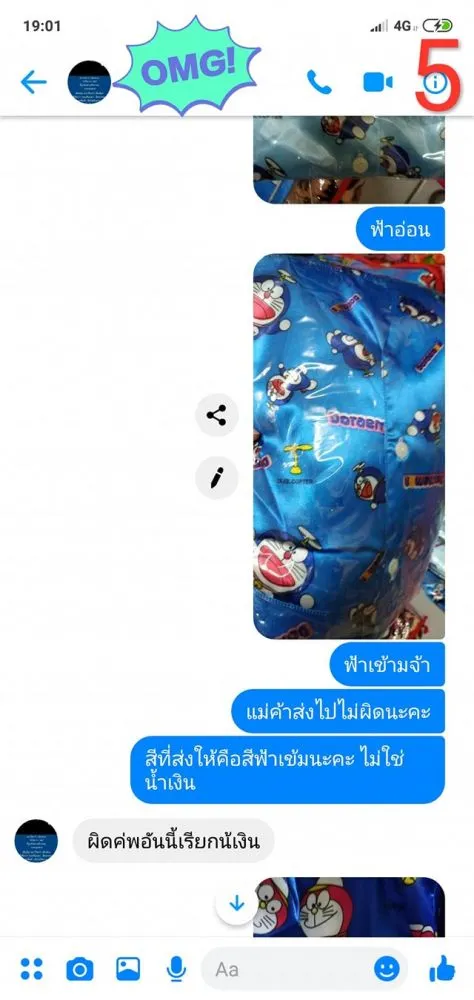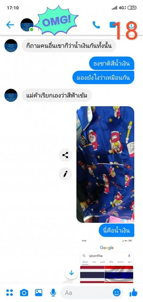 แม่ค้าจึงงัดแชทขึ้นมาเปิดเผยว่า ตอนสั่งลูกค้าต้องการสีฟ้าเข้ม ไม่ได้สั่งสีฟ้าอ่อนอย่างที่อ้างตอนหลัง แม่ค้าจึงถามย้ำว่าตนส่งของให้ผิดอย่างนั้นหรือ แทนที่ลูกค้าจะยอมรับว่าเป็นความผิดของตนที่ต้องการสีฟ้าอ่อนแต่เผลอพิมพ์สีฟ้าเข้ม เรื่องกลับไม่จบเพียงเท่านั้น เพราะลูกค้าอ้างว่า ของที่ส่งมาก็ไม่ใช่สีฟ้าเข้มอยู่ดี แต่เป็นสีน้ำเงิน