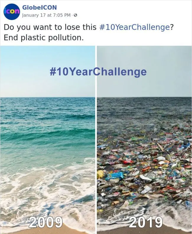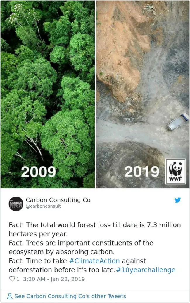 # 10YearChallenge ได้โด่งดังจนผู้คนต่างแชร์ภาพของตัวเองในช่วงนี้ สร้างรอยยิ้มและหัวเราะให้กับพวกเรา แต่เมื่อไม่นานมานี้ผู้คนเริ่มใช้มันเพื่อแสดงให้เห็นถึงการเปลี่ยนแปลงของโลกของเรา ไม่ว่าจะเป็นนักเอ็นจีโอ นักสิ่งแวดล้อม และนักกิจกรรมไปจนถึงผู้ใช้อินเทอร์เน็ตทั้งหลายกำลังบอกว่านี่เป็น # 10Yearchallence ที่เราไม่ควรมองข้าม