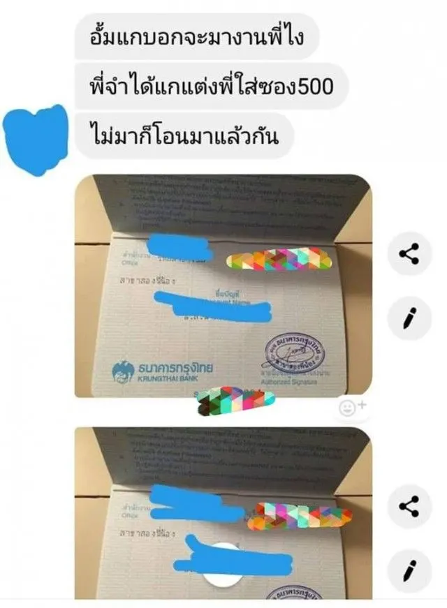 “ช่วงเดือนพฤศจิกายนมีพี่ที่ทำงานเก่าแกส่งการ์ดเชิญมาในแชท ซึ่งกำหนดงานคือวันที่19/1/62 ซึ่งเดือนธันวาคม นู๋ก้อเลยขอเวรเพื่อไปงานแต่งพี่เขาเดือนมกราคม แต่เนื่องจากมีคนลาออกและยอดผู้ป่วยเต็ม ทำให้พี่หัวหน้าไม่สามารถจัดเวรให้ได้ และประกอบกับแม่สามีนู๋ถูกรถชน จึงไม่สามารถไปร่วมแสดงความยินดีกับพี่เขาได้ค่ะ แต่นู๋ก็ตั้งใจว่าถ้าวันหยุดแล้วได้กลับบ้านที่สุพรรณ นู๋ตั้งใจจะแวะเอาซองไปให้ จนวันนี้ตอนเวลา11.10น.พี่เขาได้ส่งแชทมาทวงเงินค่าซองพร้อมว่ากล่าวนู๋อย่างมากมาย หาว่านู๋เอาแต่ได้ แต่จริงๆนู๋ไม่เคยคิดเช่นนั้นเรย ตกลงนู๋ผิดใช่มั้ยคะจี”