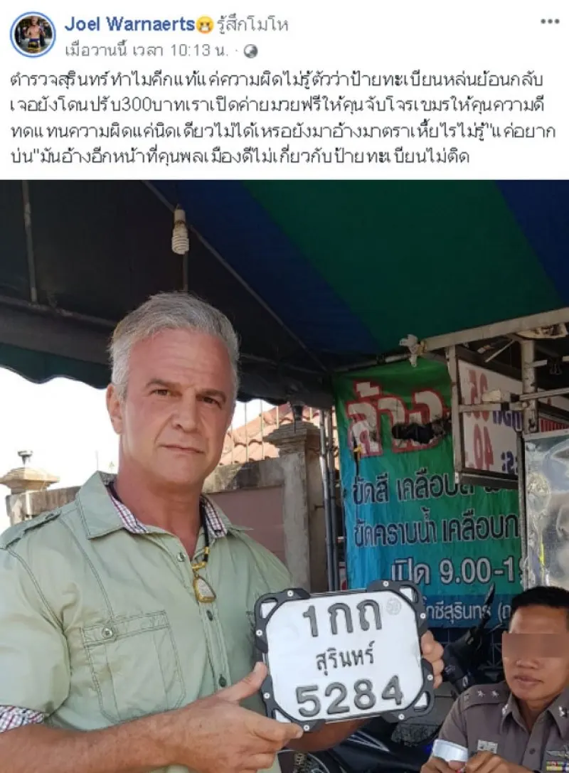 วันที่ 25 มกราคม 2562 ผู้สื่อข่าวรายงานว่า ผู้ใช้เฟซบุ๊กชื่อ Joel Warnaerts ได้เผยแพร่เรื่องราว โดยได้ระบุข้อความว่า ตำรวจสุรินทร์ทำไมคีกแท้แค่ความผิดไม่รู้ตัวว่าป้ายทะเบียนหล่นย้อนกลับเจอยังโดนปรับ300บาทเราเปิดค่ายมวยฟรีให้คุนจับโจรเขมรให้คุนความดีทดแทนความผิดแค่นิดเดียวไม่ได้เหรอยังมาอ้างมาตราเ...้ยไรไม่รู้"แค่อยากบ่น"มันอ้างอีกหน้าที่คุนพลเมืองดีไม่เกี่ยวกับป้ายทะเบียนไม่ติด
