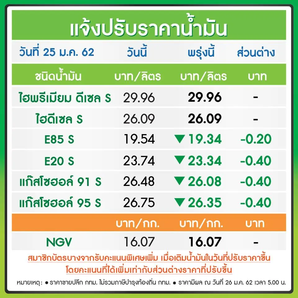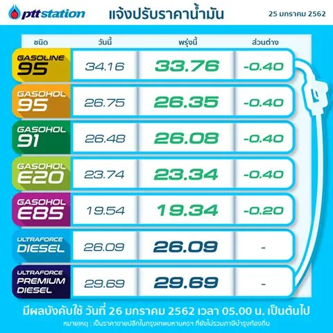 วันนี้ ( 25 ม.ค.62 ) มีรายงานว่า บริษัท ปตท. จำกัด (มหาชน) และบริษัท บางจาก คอร์ปอเรชั่น จำกัด (มหาชน) ประกาศปรับลดราคาน้ำมันกลุ่มแก๊สโซฮอล์ทุกชนิด 40 สตางค์ต่อลิตร ยกเว้น E85 ลด 20 สตางค์ต่อลิตร ส่วนกลุ่มน้ำมันดีเซลราคาคงเดิม ซึ่งจะมีผลวันพรุ่งนี้ 26 ม.ค.62 เวลา 05.00 น.เป็นต้นไป