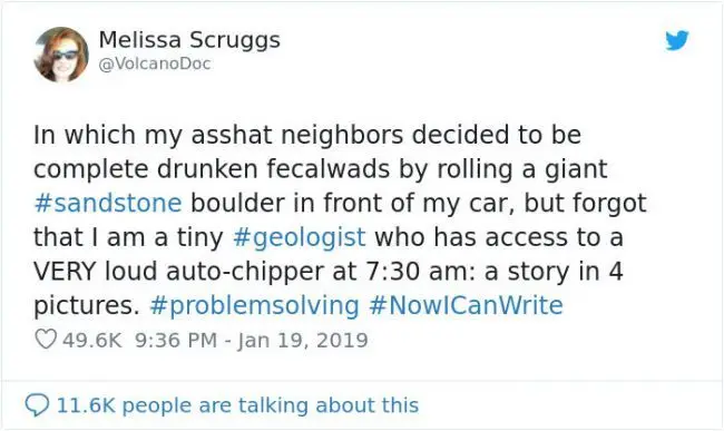 บางครั้งเพื่อนบ้านของเราก็อาจทำเรื่องแย่ๆ โดยไม่คิดถึงผลที่ตามมา Melissa Scruggs หญิงสาวที่อาศัยอยู่ที่แคลิฟอร์เนียที่กำลังเรียนปริญญาเอกในสาขาวิชาธรณีวิทยา ในเช้าวันหนึ่งเธอตื่นขึ้นมาและต้องพบกับก้อนหินขนาดยักษ์ที่ขวางรถของเธออยู่