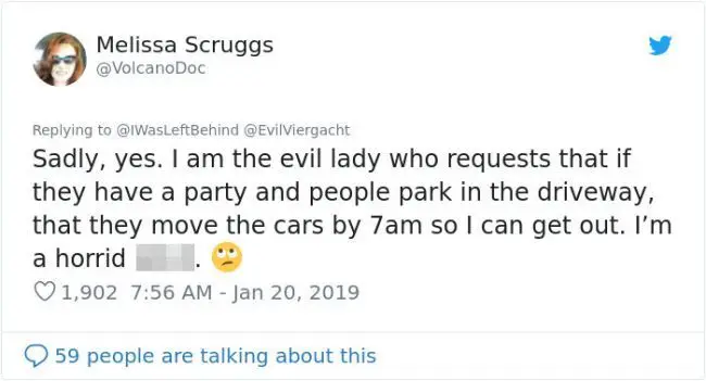 เธอทวิตว่า ใช่ฉันเป็นผู้หญิงที่ร้ายกาจ แต่ใครหละเริ่มก่อน พวกเขาจัดปารตี้ และจอดรถข้างทาง พวกเขาควรย้ายรถก่อน 7 โมง นั้นทำให้ฉันออกไปได้ ฉันเป็นคนน่ากลัว