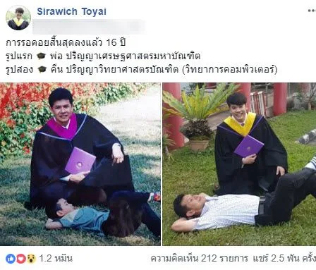 เวลาที่ครอบครัวและพ่อแม่ต่างภาคภูมิใจนั้นก็คือ เวลาที่เราได้เป็นบัณฑิต จบใหม่ เพราะการเรียนจบเป็นสัญญานที่เเสดงได้ว่าเราเริ่มเติบโตเข้าสู้วัยทำงานเป็นที่เรียบร้อย เเต่เชื่อว่า กว่าจะมาถึงวันที่รับใบปริญญานั้นต้องฟันฟ่ากันมาพอสมควร วันนี้เราเลยมีตัวอย่างภาพที่น่าประทับใจใาฝากทุกคนโดย เจ้าของบัญชีเฟซบุ๊กนามว่า “Sirawich Toyai”โพสต์ข้อความเเละรูปภาพเพียงสั้นๆระบุว่า