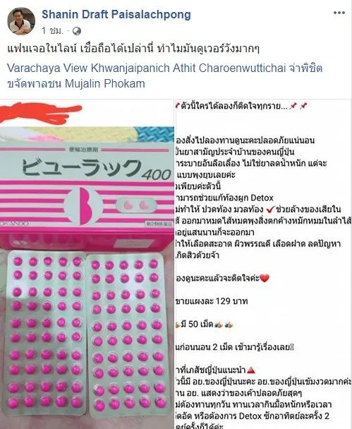 อย่างเช่นเรื่องรางจากผู้ใช้เฟซบุ๊กชื่อ Shanin Draft Paisalachpong ที่ออกมาถามความเป็นจริงของยาชนิดหนึ่ง ซึ่งประกาศขายทางไลน์ อ้างสรรพคุณช่วยในการระบาย พุงยุบ และอ้างว่าเภสัชกรญี่ปุ่นกำลังแนะนำ ซึ่งหากได้อ่านสรรพคุณก็ดูจะดีจนเกินเหตุ