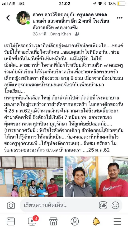โดย Kowit Aiadnate ระบุว่า ขอความช่วยเหลือครอบครัว เด็กหญิง เขมินตรา เที่ยงธรรม อายุ 8 ขวบ นักเรียนโรงเรียนสังวาลย์วิท 7 อำเภอบางขัน จ.นครศรีธรรมราช เนื่องจากน้องประสบอุบัติเหตุรถชนขณะนั่งรถมอเตอร์ไซด์กับเพื่อนบ้านมาโรงเรียน… กระดูกทับเส้นเลือดใหญ่ ต้องส่งตัวไปผ่าตัดต่อที่โรงพยาบาล มอ.หาดใหญ่ ซึ่งต้องใช้เงินถึง 7 หมื่นบาท