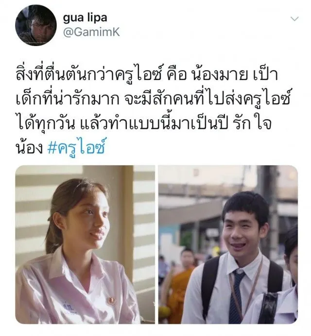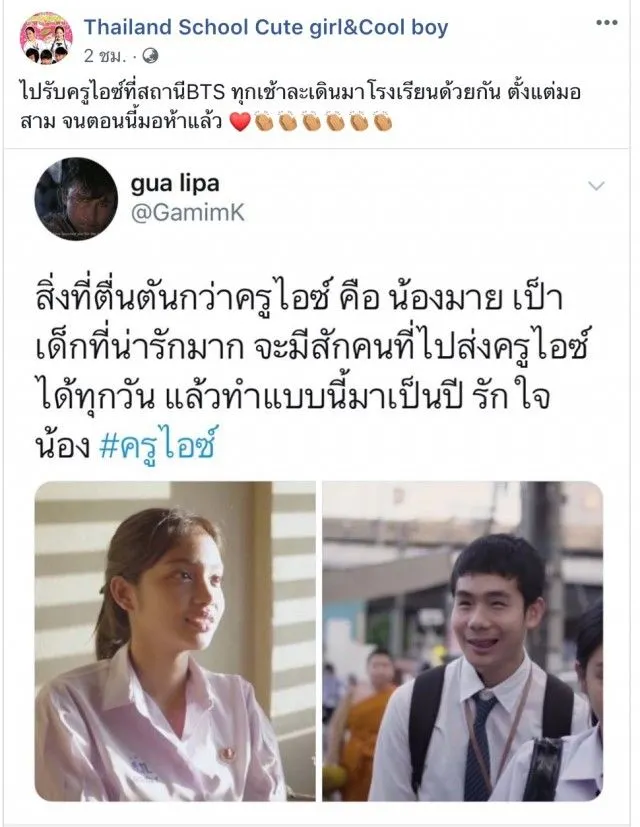ชาวเน็ตแห่กดไลค์แห่ทวิตกัน ยิ่งกว่าเรื่องราวของคูรไอซ์ ก็คือ เรื่องของน้องมาย นักเรียนหญิงผู้ที่ ไปรับครูไอซ์ ที่สถานี BTS ทุกเช้าละเดินมาโรงเรียนด้วยกัน ตั้งแต่ม3 . จนตอนนี้น้องอยู่ ม.5 แล้ว น้องก็ยังทำแบบนี้อยู่ทุกวัน บอกเลยว่า ของยกย่องและชื่นชม ทั้ง ครูไอซ์และน้องมาย จริงๆ