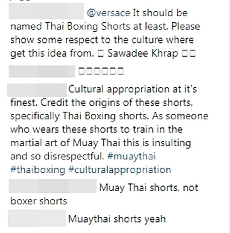 คอมเมนต์ระบุว่า สิ่งนี้เป็น cultural appropriation หรือการฉวยใช้วัฒนธรรม ซึ่งเป็นประเด็นที่มักจะถูกถกเถียงในวงการแฟชั่นอยู่เสมอ อย่างไรก็ดี แม้จะมีการหยิบยืมวัฒนธรรมของประเทศอื่นมาใช้ อย่างน้อยก็ควรที่จะให้เครดิต โดยเฉพาะกางเกงมวยไทย เพราะมันไม่เพียงแต่เป็นกีฬา แต่ยังเป็นศิลปะการป้องกันตัวเอกลักษณ์ของชาติไทย การที่ทางแบรนด์ทำเช่นนี้ มองว่าเป็นการไม่เคารพและไม่ให้เกียรติ