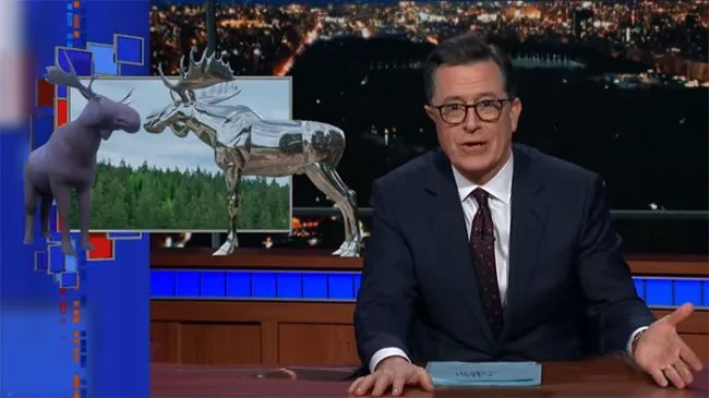 Stephen Colbert พืธีกรชาวอเมริกัน เลือกข้างกวางมูสของนอร์เวย และบอกว่า “กวางมูสของแคนนาดาเหมือนกับสุนัขเปเปอร์มาเช่ ในสวนสัตว์ร้าง ”