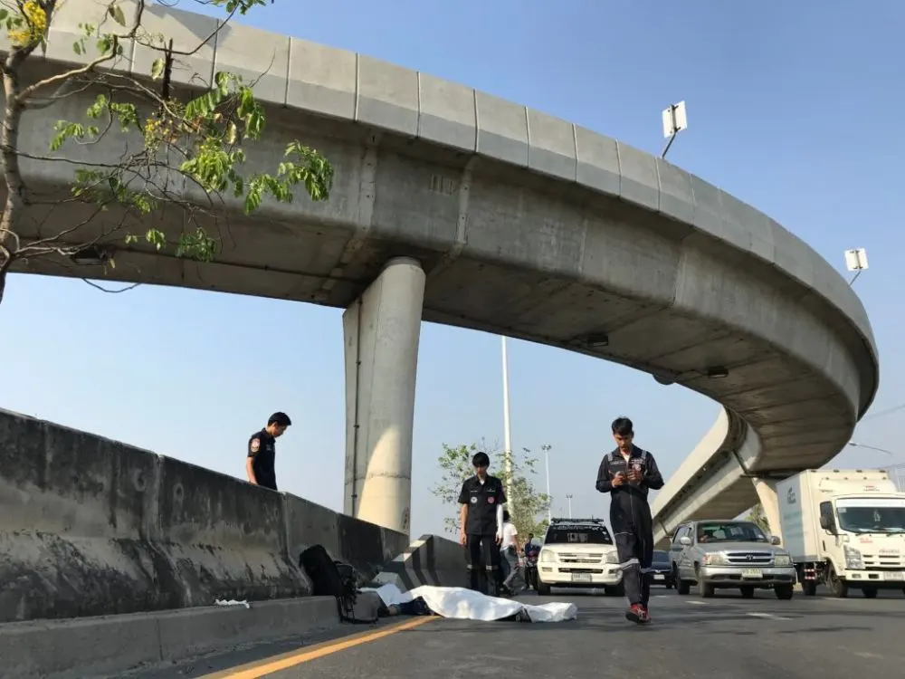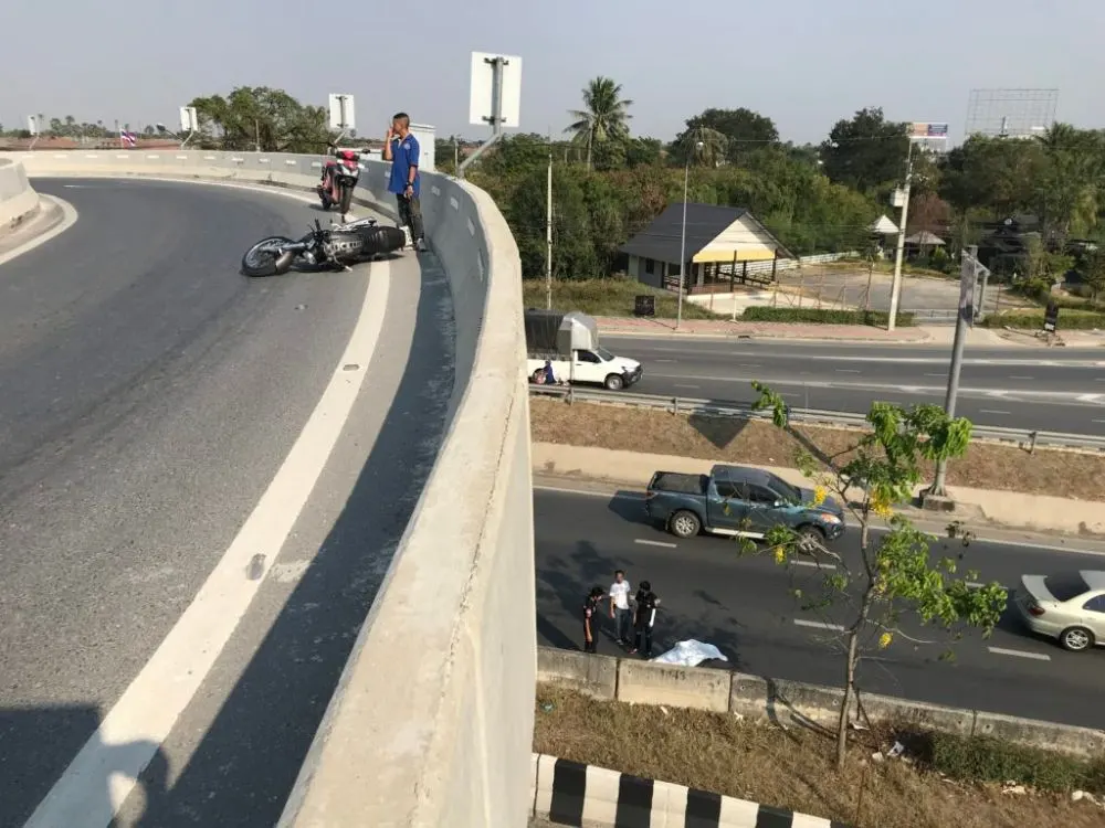 หนุ่มวัย 26 ควบ จยย.หลุดโค้งสะพานกลับรถร่างลอยตกลงพื้นสูง 5 เมตรดับคาที่
