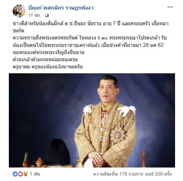 ต่อมาวันที่ 29 มกราคม 2562 ผู้สื่อข่าวรายงานว่า วานนี้ผู้ใช้เฟซบุ๊กชื่อ บีคุงก์ พสกนิกร ราษฏรพังงา ได้เผยถึงเรื่องกรณีดังพร้อมระบุข้อความว่า ข่าวดีสำหรับน้องดีแม็กส์ ด.ช.ยืนยง ชัยราบ อายุ 7 ปี และครอบครัว เยื่อหมารุมกัด ความทราบถึงพระเนตรพระกันต์ ในหลวง ร.๑๐ ทรงพระกรุณาโปรดเกล้า รับน้องเป็นคนไข้ในพระบรมราชานุเคราห์แล้ว เมื่อช่วงค่ำที่ผ่านมา 28 มค 62 ขอพระองค์ทรงพระเจริญยิ่งยืนนาน ด้วยเกล้าด้วยกระหม่อมขอเดชะ ครูอาคม ครูของน้องแจ้งมานะครับ