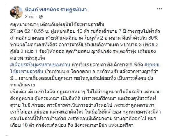 จากกรณี เด็กชายวัย 7 ขวบ ถูกสุนัขจรจัดรุมกัด ส่งผลให้ โดยรอบบริเวณลำคอของเด็กชายมีแผลฉีกขาด นอกจากนี้ยังพบว่าใบหูทั้ง 2 ข้างก็ฉีกขาดด้วย ส่วนบริเวณแขน และขา มีร่องรอยสุนัขกัดทั่วร่างกาย