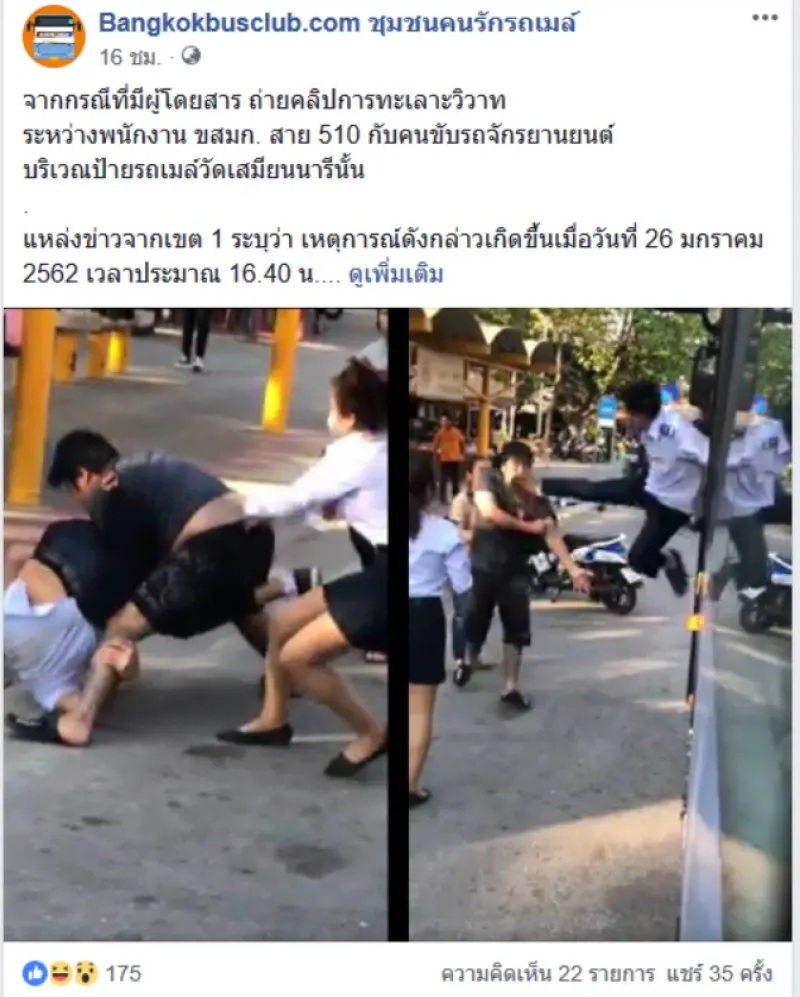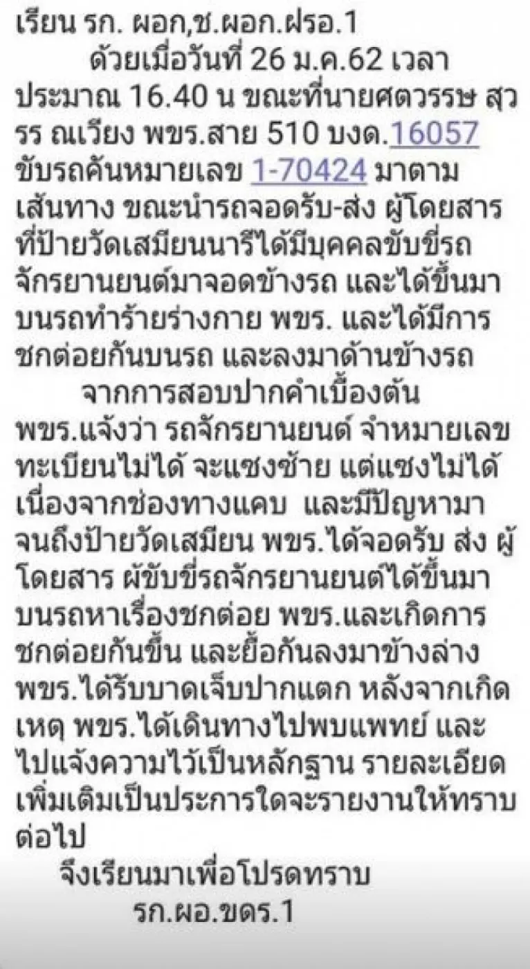 จนเมื่อรถจอดที่ป้ายวัดเสมียนนารี พขร.ได้จอดรับ-ส่งผู้โดยสาร แต่ผู้ขับขี่จักรยานยนต์ได้ขึ้นมาบนรถ หาเรื่องชกต่อย พขร. และเกิดการทะเลาะวิวาทกันขึ้น จนออกมานอกรถ หลังเกิดเหตุ พขร.ได้ไปพบแพทย์เนื่องจากปากแตก และไปแจ้งความไว้เป็นหลักฐานแล้ว