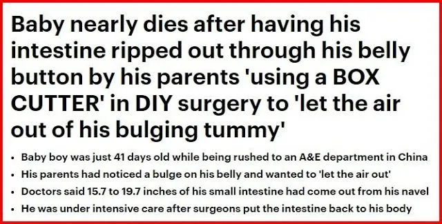 ภาวะไส้เลื่อนตกมาอยู่บริเวณสะดือ ซึ่งเป็นเรื่องปกติสำหรับทารกแรกเกิด โดยเฉพาะทารกที่เกิดก่อนกำหนด แต่สำหรับพ่อแม่คู่นี้ดันเข้าใจผิด คิดว่าลูกตัวเองมีลมในช่องท้อง พองป่องเยอะ ด้วยความเป็นห่วงจึงในคัตเตอร์กรีดช่องท้องเป็นแผลยาวกว่า 20 นิ้วเพื่อไล่ลมออกให้ลูกน้อย กลายเป็นว่าไส้ที่เลื่อนมา มันทะลักออกมานอกตัวทารกน้อยจนติดเชื้อ ก่อนจะนำส่งโรงพยาบาลอย่างรวดเร็ว