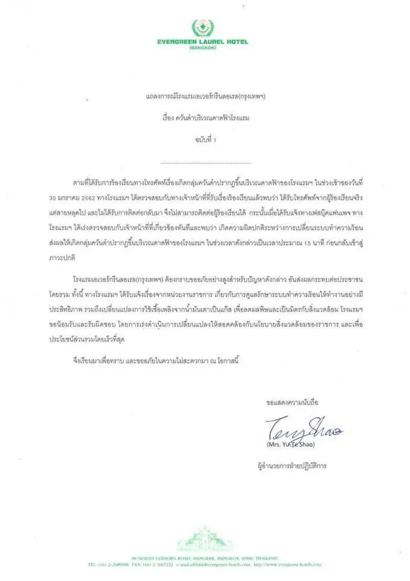 ล่าสุด เมื่อช่วงเย็นที่ผ่านมา เพจเฟซบุ๊ก Evergreen Laurel Hotel Bangkok หรือ โรงแรมเอเวอร์กรีนเลอเรล (กรุงเทพฯ) ได้โพสต์หนังสือแถลงการณ์ชี้แจงในกรณีดังกล่าว โดยระบุว่า ทางโรงแรมตรวจสอบความผิดปกติดังกล่าวแล้ว และพบว่าเกิดจากการเปลี่ยนระบบทำความร้อน ส่งผลให้เกิดกลุ่มควันดำบริเวณดาดฟ้าของโรงแรม เป็นเวลาประมาณ 15 นาที ก่อนกลับเข้าสู่ภาวะปกติ