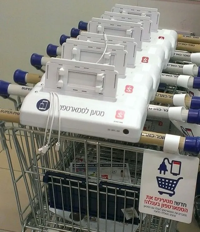 ซูเปอร์มาร์เก็ตในประเทศอิสราเอลที่ใครๆ ก็อยากแวะเวียนเข้าไปใช้งาน เพราะรถเข็นของพวกเขานั้นมีบริการชาร์จแบตเตอรี่มือถือและอุปกรณ์อิเล็กทรอนิกส์ฟรี เรียกได้ว่าเป็นการปรับตัวที่ทันยุคทันสมัยมาก