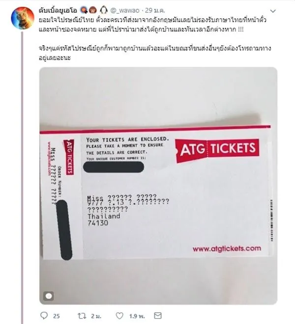 "ยอมใจไปรษณีย์ไทย ตั๋วละครเวทีส่งมาจากอังกฤษมันเลยไม่รองรับภาษาไทยที่หน้าตั๋วและหน้าซองจดหมาย แต่พี่ไปรฯนำมาส่งได้ถูกบ้านและทันเวลาอีกต่างหาก !!! จริงๆแค่รหัสไปรษณีย์ถูกก็พามาถูกบ้านแล้วอะแต่ในขณะที่ขนส่งอื่นๆยังต้องโทรถามทางอยู่เลยอะนะ"