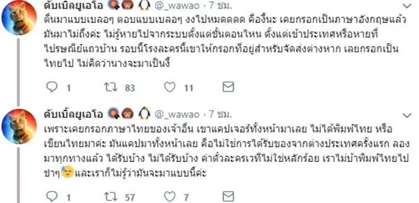 นอกจากนี้ยังเสริมอีกว่า เคยกรอบเป็นภาษาอังกฤษแล้ว แต่ของมาไม่ถึง ไม่รู้หายไปตอนไหน รอบนี้โรงละครให้กรอกที่อยู่สำหรับจัดส่งต่างหาก จึงกรอกเป็นภาษาไทย และไม่คิดว่าจะออกมาในลักษณะนี้
