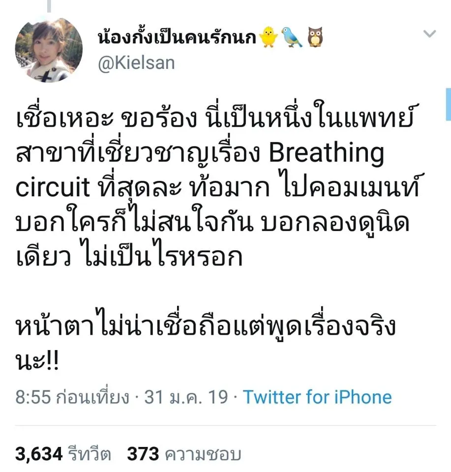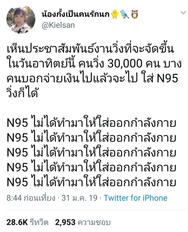 "เห็นประชาสัมพันธ์งานวิ่งที่จะจัดขึ้นในวันอาทิตย์ที่จะถึงนี้ คนวิ่ง 3หมื่นคน เห็นบาวคนบอกว่าจ่ายเงินไปแล้วจะไป ใส่ N95 วิ่งก็ได้ ซึ่งคุณหมอได้บอกเสียงแข็งยืนยันเลยว่า N95 ไม่ได้ทำมาให้ใส่ออกกำลังกาย การใส่N95ทำให้แรงต้านอากาศเวลาหายใจเพิ่มขึ้น เวลาหายใจเข้าเราใช้กล้ามเนื้อ จะใช้แรงมากขึ้น เวลาหารใจออกใช้ elastic recoil ถ้าพยายามหายใจออกเยอะจะเหนื่อย หายใจออกจะออกไม่หมดหน้ากากมีลมหายใจออกมี O2 ต่ำCO2สูงค้างในหน้ากาก หายใจเข้ารอบหน้าได้อากาศนี้เรียก Rebreathing ซึ่งRebreathing ในหน้ากากอาจมองว่าน้อย แต่ในการออกกำลังกายใช้ O2มาก ร่างกายผลิต CO2มากกว่าปกติมันจะค่อยๆส่งผลต่อเนื่องในการหายใจครั้งต่อไป ทำให้ขาด O2 มีCO2 เกินในร่างกายหมดสติ เสียชีวิตได้ อันตรายมาก"