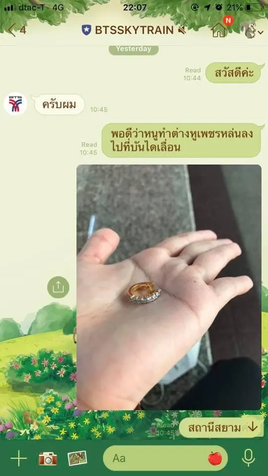 ผู้ใช้เฟซบุ๊กชื่อ Dusaya Sukwarapirom โพสต์เมื่อวานนี้ (1 ก.พ.) ขอบคุณทาง รถไฟ BTS และเจ้าหน้าที่ที่เกี่ยวข้อง หลังจากเมื่อวันพฤหัสบดีที่ผ่านมา (31 ม.ค.) ตนทำตุ้มหูเพชรตกลงไปในช่องบันไดเลื่อนที่สถานีรถไฟฟ้าสยาม ในช่วงที่มีผู้โดยสารจำนวนมาก จึงไม่กล้าก้มลงไปเก็บ เพราะขณะนั้นใกล้สิ้นสุดบันไดเลื่อนและกลัวว่าตัวเองจะได้รับบาดเจ็บ