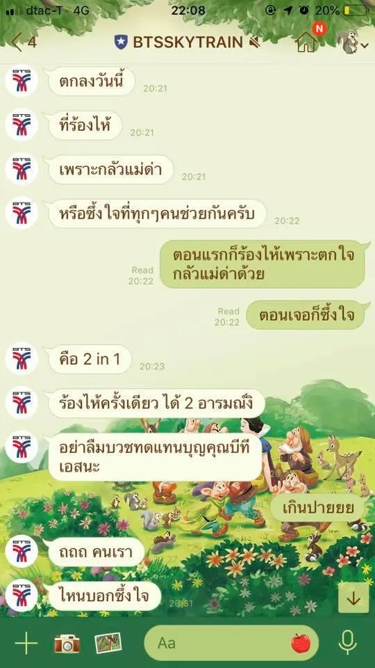 "สุดท้ายนี่ก็ขอบคุณทุกคน ละก็โทรบอกแม่ร้องไห้ไปอีกรอบเรียบร้อย แม่ก็โอเค ไม่ด่าอะไร คือกลัวไปเอง แบบว่าอยากให้ทุกคนรู้ว่าบีทีเอสไม่ได้เป็นแค่รถไฟฟ้าธรรมดานะจ๊ะ แต่เค้ามีความใส่ใจและเป็นห่วงความรู้สึกของผู้โดยสารด้วย"