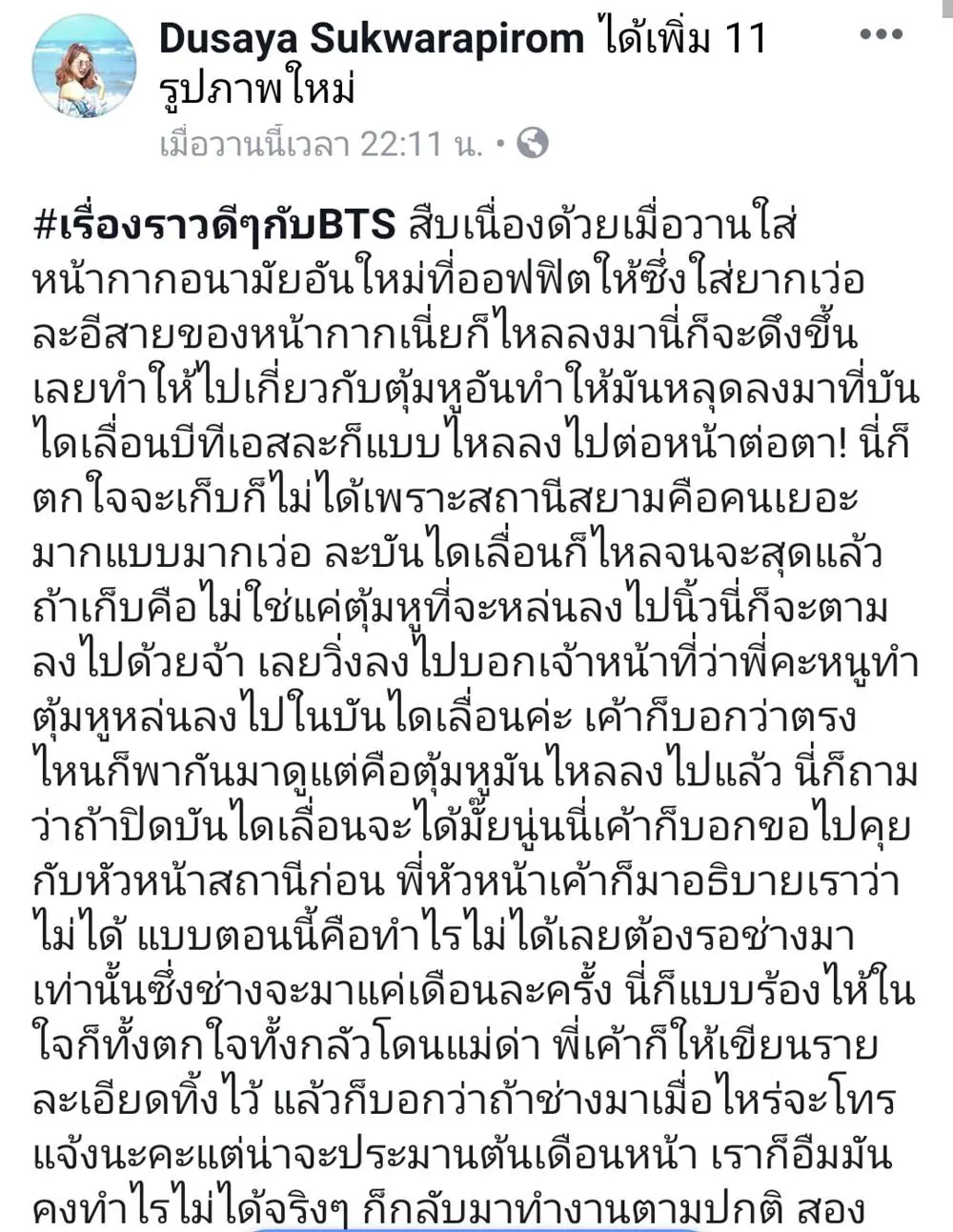 "นี่ก็ถามว่าถ้าปิดบันไดเลื่อนจะได้มั๊ยนู่นนี่เค้าก็บอกขอไปคุยกับหัวหน้าสถานีก่อน พี่หัวหน้าเค้าก็มาอธิบายเราว่าไม่ได้ แบบตอนนี้คือทำไรไม่ได้เลยต้องรอช่างมาเท่านั้นซึ่งช่างจะมาแค่เดือนละครั้ง นี่ก็แบบร้องไห้ในใจก็ทั้งตกใจทั้งกลัวโดนแม่ด่า พี่เค้าก็ให้เขียนรายละเอียดทิ้งไว้ แล้วก็บอกว่าถ้าช่างมาเมื่อไหร่จะโทรแจ้งนะคะ แต่น่าจะประมานต้นเดือนหน้า เราก็อืมมันคงทำไรไม่ได้จริงๆ ก็กลับมาทำงานตามปกติ" ผู้โพสต์ ระบุ